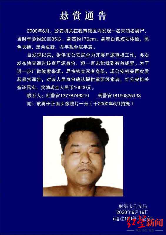 今年9月19日,四川射洪市公安局发布悬赏通告,寻找辖区内20年前发现的一名未知名男尸线索。