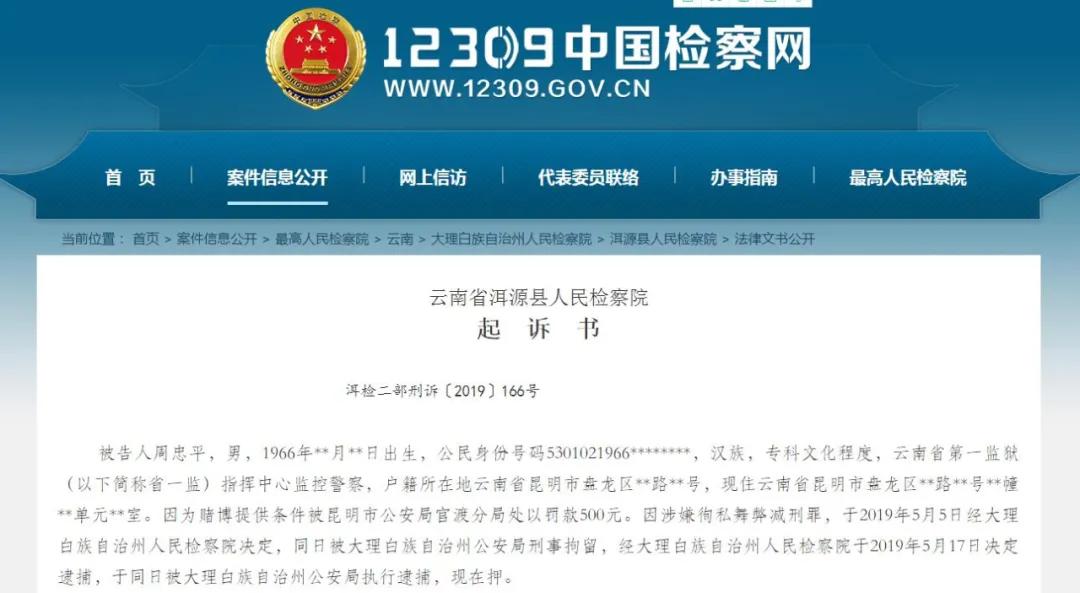 被告人周忠平,男,1966年**月**日出生,公民身份号码5301021966********,汉族,专科文化程度,云南省第一监狱(以下简称省一监)指挥中心监控警察,户籍所在地云南省昆明市盘龙区**路**号,现住云南省昆明市盘龙区**路**号**幢**单元**室。因为赌博提供条件被昆明市公安局官渡分局处以罚款500元。因涉嫌徇私舞弊减刑罪,于2019年5月5日经大理白族自治州人民检察院决定,同日被大理白族自治州公安局刑事拘留,经大理白族自治州人民检察院于2019年5月17日决定逮捕,于同日被大理白族自治州公安局执行逮捕,现在押。