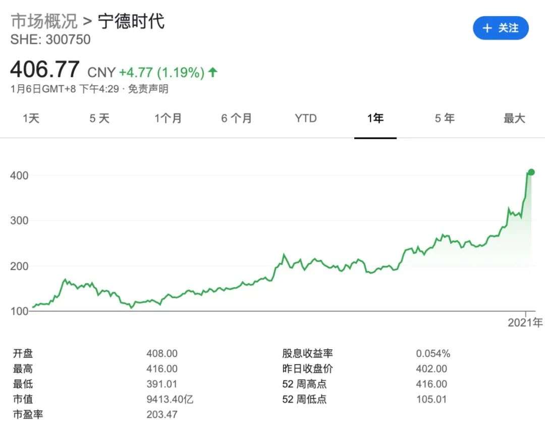 2021年开市第一天,宁德时代股价突破400元大关,市值站上9000亿元。截至1月6日,宁德时代股价报收406.77元,在过去一年间涨幅超274.9%,市值达到9413.40亿元,跃居整个深交所上市企业第二名,仅次于五粮液,距离万亿市值也只差一口气。