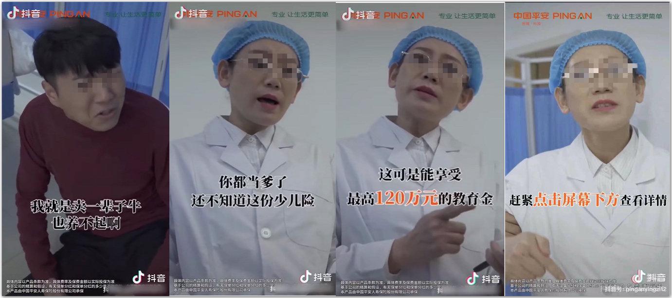 在另一则视频广告中,一个男子在产房外听到医生说妻子生了双胞胎男孩,跌倒在地,喊道:“俩男娃娃,我就是卖一辈子牛也养不起啊。” 此时,医生表示“你们年轻人,赶上好时代都不知道。”说完便展示了中国平安的平安英才宝贝保险计划;男子听完介绍表示“我听同事提过”,求问医生去哪里咨询这款保险产品。医生张口而道:“趁孩子还小,赶紧点击屏幕下方查看详情,免费测算保费吧。”