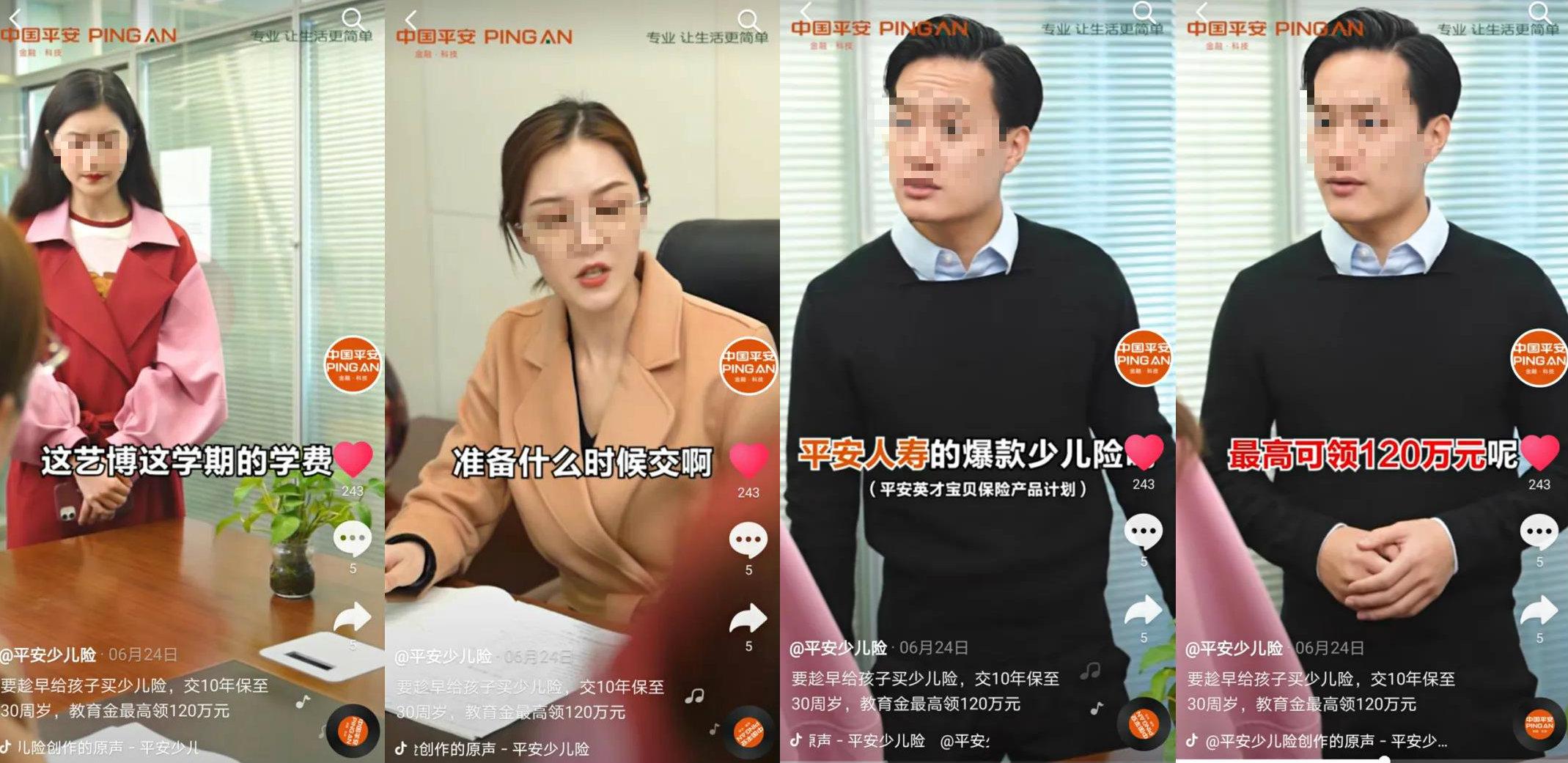 另一则视频广告中,一位老师问穿红衣的女士,孩子的学费准备什么时候交啊?红衣女士表示,学校这几年学费涨得快,等孩子再大的,这学费、生活费就更高了。此时一位老师走过来开始介绍平安英才宝贝保险计划。