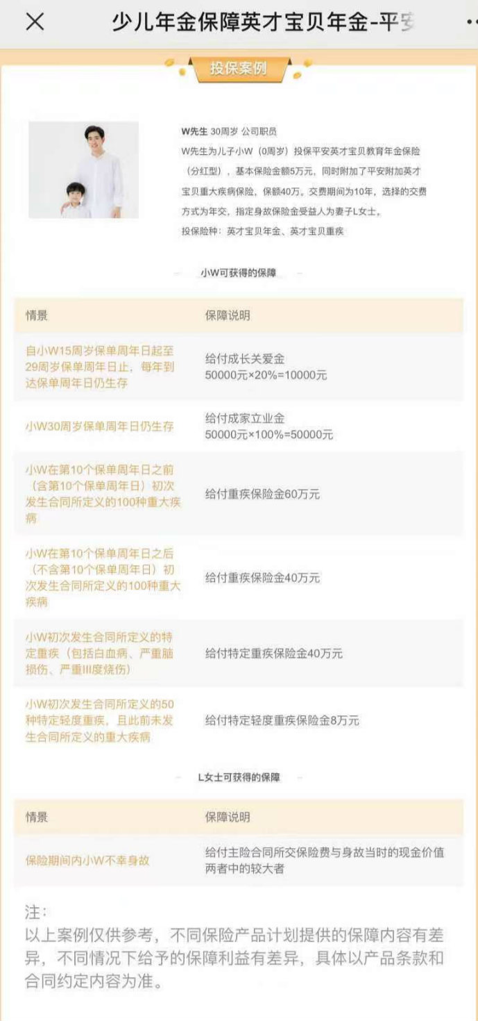 一则视频广告里面,一位女士因为担心生完二胎家里生活质量会下降,而犹豫生二胎。但是丈夫和妈妈/婆婆却以可以买平安人寿英才宝贝保险产品计划来解决后顾之忧,让她安心。两人表示,同事和邻居都买了这款保险。孩子长大后最高享受120万元的教育金,保100种重疾,50种轻症,最高赔付可达135万,交满10年还能保至30岁,之后还有机会获得分红。女士听后,表示要给明明(第一胎)买一份。