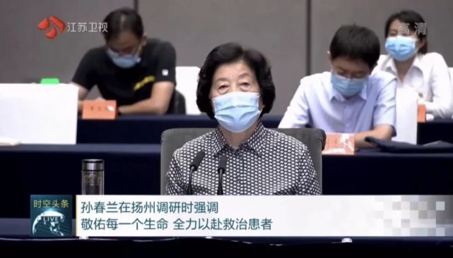 8月14日,孙春兰在调研中听取了扬州定点救治医院的专家、医生、护士代表关于目前患者救治情况的介绍,通过视频连线重症病房内的医疗队员,听取大家关于进一步做好患者救治工作的意见建议。
