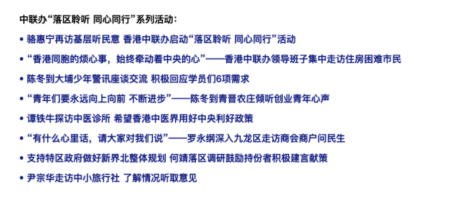 今年的9月30日,香港中联办发布消息,在国庆期间启动“落区聆听 同心同行”活动。以骆惠宁的走访为开场,所有领导班子成员,包括副主任陈冬、卢新宁、谭铁牛、罗永纲、何靖、尹宗华,秘书长王松苗都陆续深入香港基层社区,了解市民生活。