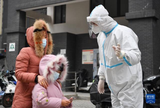 12月27日,在西安市雁塔区孟村小区,卢晨阳(右)向居民介绍核酸检测注意事项 新华社记者 张博文 摄