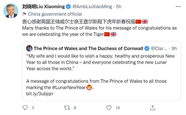 中国政府朝鲜半岛事务特别代表、前驻英国大使刘晓明在社交媒体上转发了查尔斯王子的推特,并同样用中英文写道:“衷心感谢英国王储威尔士亲王查尔斯殿下虎年新春祝福。