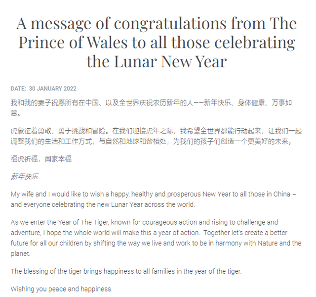 另据环球网报道,当地时间1月30日,英国威尔士亲王官方网站刊登查尔斯王子用中文和英文发表的双语新年祝福,“我和我的妻子祝愿所有在中国、以及全世界庆祝农历新年的人——新年快乐、身体健康、万事如意。”