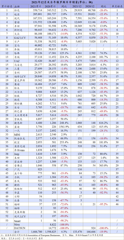 2010年和2015年前后,俄罗斯车市因政治和经济原因多次腰斩式滑坡,便是前车之鉴。按照欧洲商会AEB预计,在政治局面不恶化、没有新的贸易限制(特别是制裁)的前提下,2022年俄罗斯轻型车市场销量将达到172万辆,同比增长约3.3%。这个前提条件,看来已经只是个美好的设想。