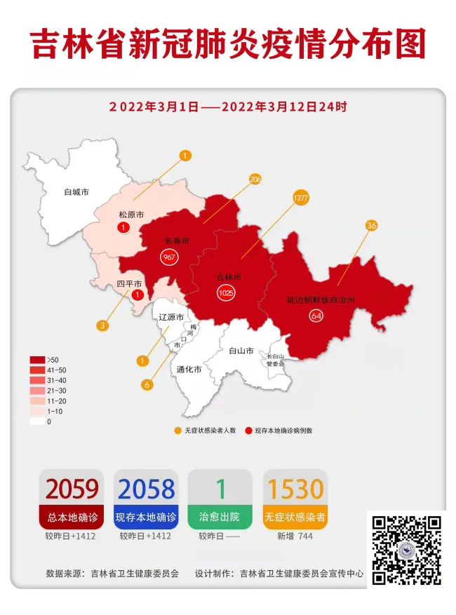 本土病例1412例:其中长春市831例、吉林市571例、延边朝鲜族自治州9例、四平市1例;