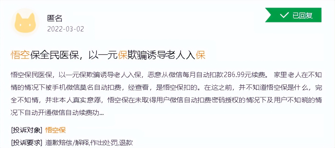 今年3·15期间,悟空保以“首月0元、1元”“免费领取”等获取高额保费为噱头,套路消费者投保的行为再次被曝光。3月22日银保监会表示,将开展立案调查,严肃查处悟空保涉及的保险公司和保险中介公司的违法违规行为,保护消费者合法权益。