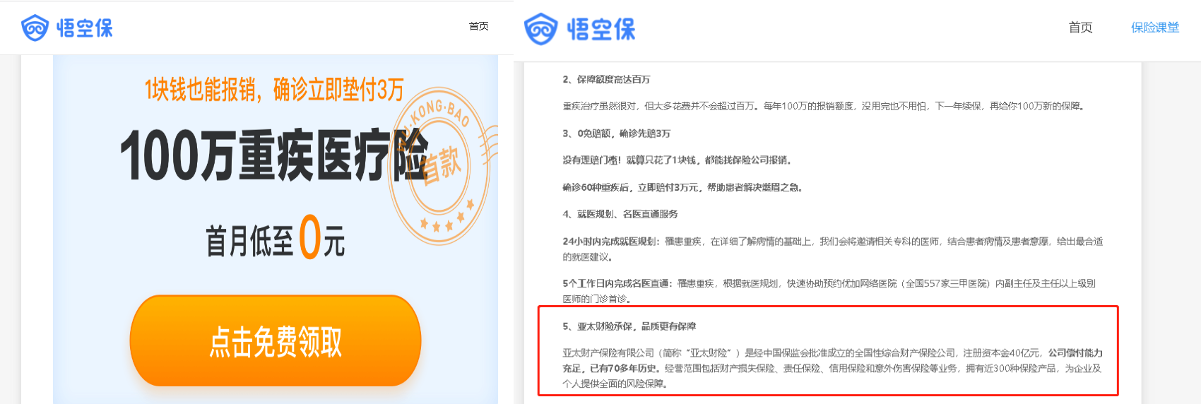 北青金融查阅悟空保官网发现,其官网仍有“首月0元”相关宣传。相关宣传产品系亚太财险旗下100万重疾医疗险。