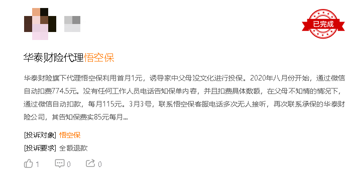 截止3月28日,黑猫投诉上关于悟空保的投诉量仍高达9572条。投诉理由主要集中于虚假宣传、未经同意微信自动扣费、诱导老年人点击并自动扣费、盗取个人信息等。其中,多条投诉信息提及,家老人误信“首月1元”宣传,通过悟空保购买华泰财险相关保险产品,在不知情的情况下,被自动扣款。在追回欠款时,保险公司与悟空保双方互相踢皮球。