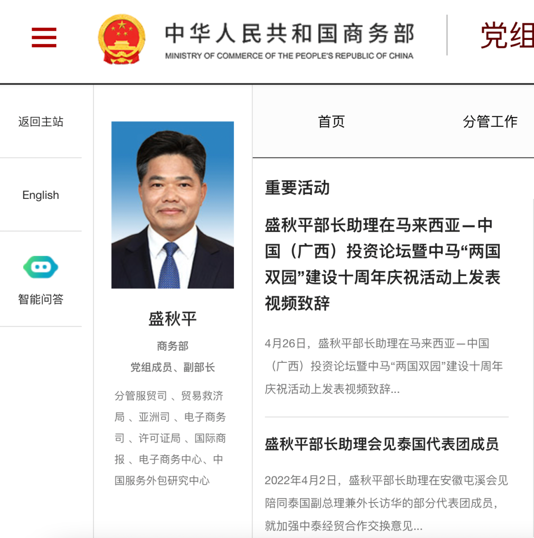 商务部官网“机构设置”一栏最新信息显示,盛秋平已任商务部副部长。