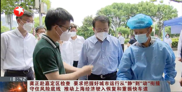 同一天,上海市市长龚正在嘉定区检查疫情防控和复工复产工作。