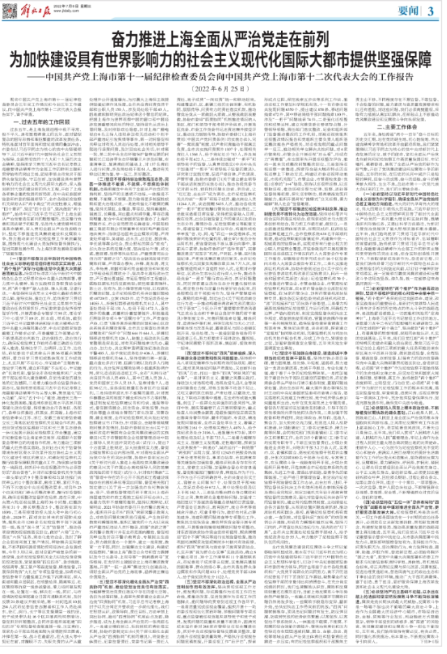 7月6日,《解放日报》3版全文刊发了中国共产党上海市第十一届纪律检查委员会向中国共产党上海市第十二次代表大会的工作报告。