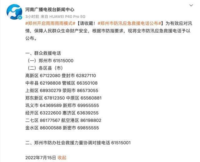 当日,郑州市还公布了防汛应急救援电话: