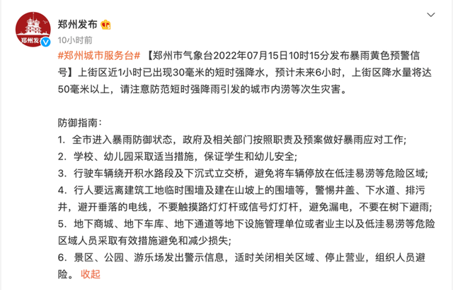 政知君注意到,7月15日,“郑州发布”发布消息称,全市进入暴雨防御状态,政府及相关部门按照职责及预案做好暴雨应对工作。行驶车辆绕开积水路段及下沉式立交桥,避免将车辆停放在低洼易涝等危险区域等。