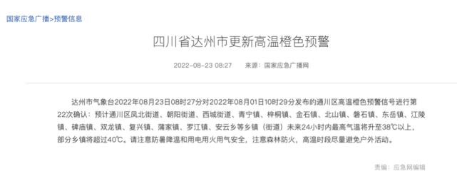 同一天,达州市大竹县、开江县、宣汉县、万源市和达川区先后更新了高温红色/橙色预警,多地气温将超过40℃以上,其中大竹县预计“未来24小时内最高气温将升至40℃以上,部分地方将超过43℃”。