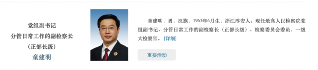 最高人民检察院党组副书记、分管日常工作的副检察长(正部长级)是童建明,2020年5月任现职。