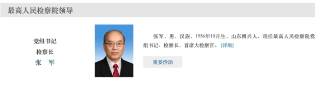 目前,最高人民检察院党组书记,检察长、首席大检察官是张军。