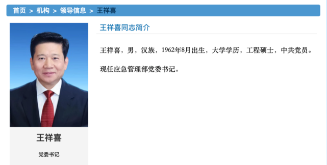 王祥喜,男,汉族,1962年8月出生,大学学历,工程硕士,中共党员。现任应急管理部党委书记。