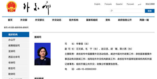 目前担任外交部新闻司司长的是华春莹,副司长分别是汪文斌、毛宁、赵立坚、胡键、蒋小燕。