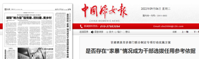 政知道(微信ID:upolitics)注意到,《中国妇女报》9月6日刊发文章披露,甘肃酒泉市多部门联合制定专项行动实施方案,其中是否存在“家暴”情况成为干部选拔任用参考依据。