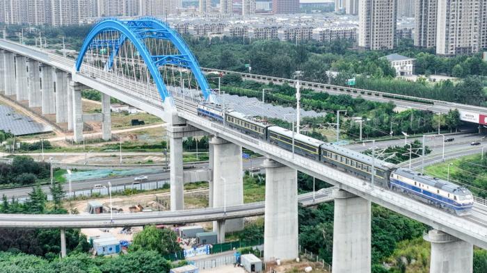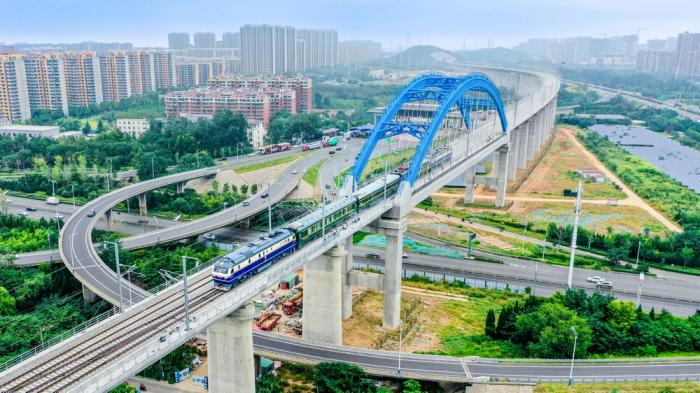 9月15日,检测列车驶过济莱高铁历城站特大桥(无人机照片)。济莱高铁是山东济南“米字型”高铁网的重要组成部分,设计时速350公里。