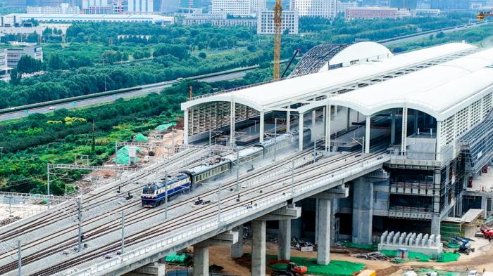 9月15日,检测列车驶过济莱高铁历城站(无人机照片)。当日,济(南)莱(芜)高铁联调联试正式启动,由中铁十局、中建八局承建的济莱高铁5座新建站房也已进入装饰装修阶段。