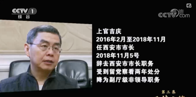 上官吉庆,2016年2月至2018年11月任西安市市长,2018年11月5号辞去西安市市长职务,受到留党察看两年处分,降为副厅级非领导职务。中央工作组当时发现,2014年对202栋违建别墅整治之后,秦岭北麓仍然不断出现违规新建别墅达六百余栋之多,像群贤别业、达观天下、草堂山居、山水草堂等别墅项目,甚至成为西安房地产的高端代表。在节目中,上官吉庆说,“怕这些问题延续这么些年了,背后肯定有这样那样复杂的人际关系,要拆这个别墅,肯定要伤害某些人的利益等等。人家都多少年了,这些问题都存在下来了,你能把这个问题能解决到一个什么程度?当然我也有一个活思想,觉得这些事情是在我之前的事情,多少有一点新官怕理旧帐。”