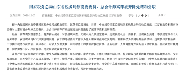 10月12日,中央纪委国家监委官网发布了《发挥室组地联合办案系统优势,推动审查调查工作高质量开展》一文。文中披露了山东省税务局原党委委员、总会计师高萍一案的更多细节。