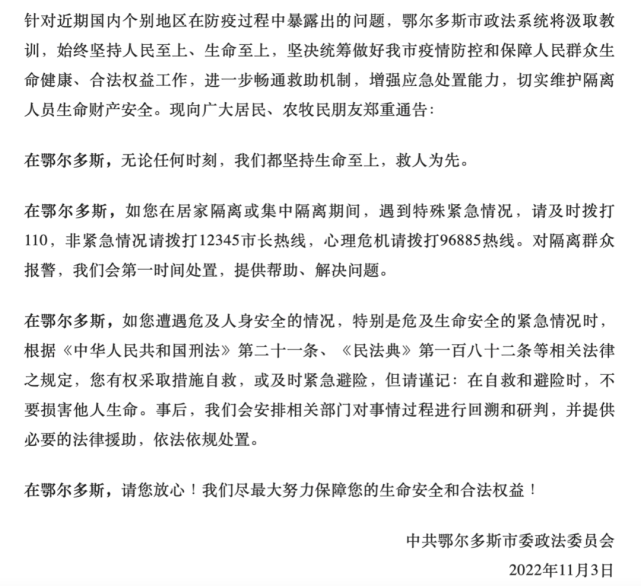 通告中说,针对近期国内个别地区在防疫过程中暴露出的问题,鄂尔多斯市政法系统将汲取教训,始终坚持人民至上、生命至上。