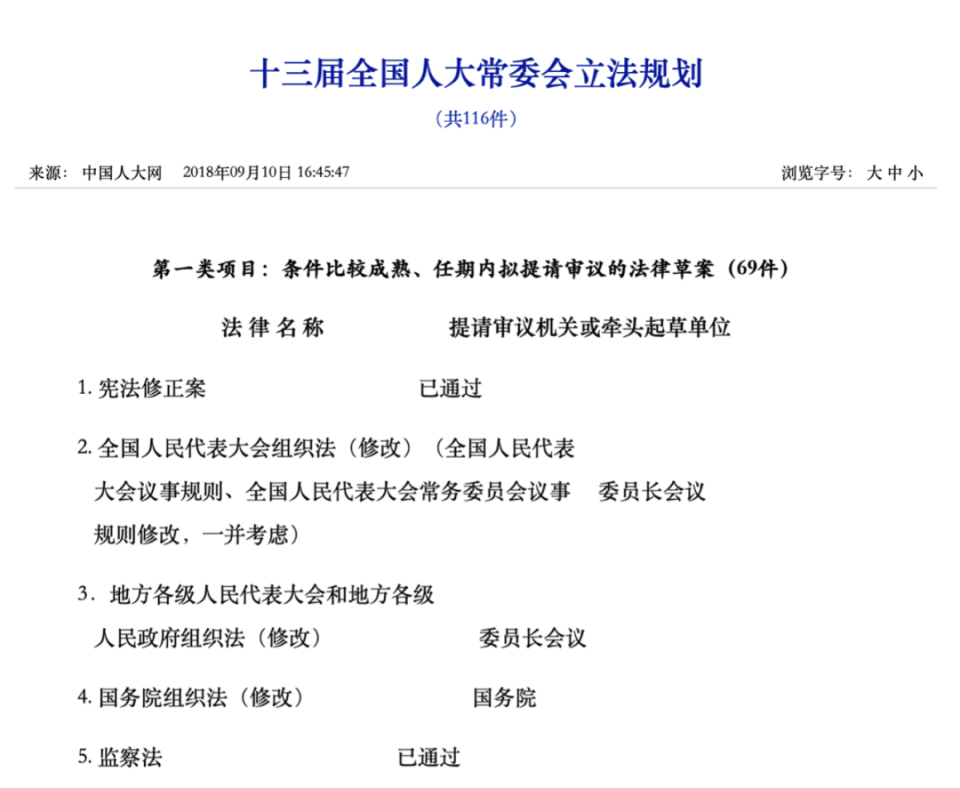 5年前(2018年9月),中国人大网公布了《十三届全国人大常委会立法规划(共116件)》。
