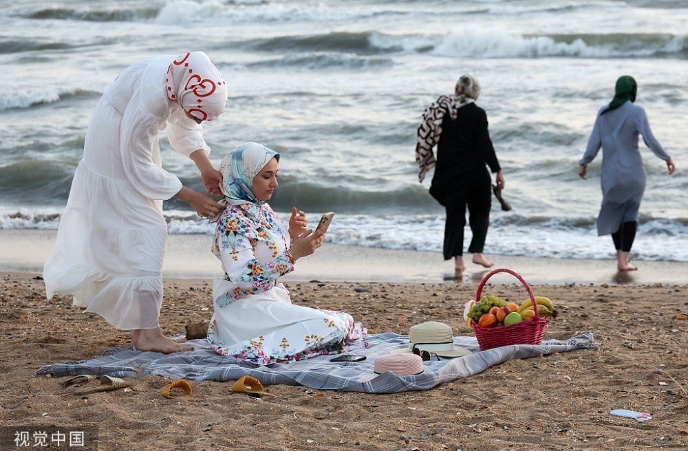 当地时间2022年8月21日,俄罗斯达吉斯坦共和国,民众在里海边游玩 图源:视觉中国