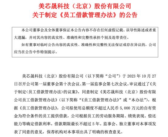 10月30日晚,美芯晟(688458)公布了《员工借款管理办法》。其核心内容是,公司拟使用总额度不超过5000万元的自有资金,为符合条件的员工提供借款。