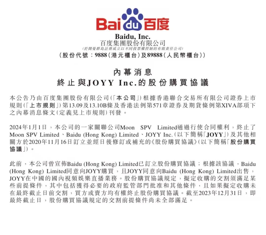 根据百度最新公告,公司曾宣布Baidu (Hong Kong) Limited已订立股份购买协议;根据该协议,Baidu (Hong Kong) Limited同意向JOYY(欢聚集团)购买,且JOYY同意向Baidu (Hong Kong) Limited出售JOYY在中国的国内视频娱乐直播业务。