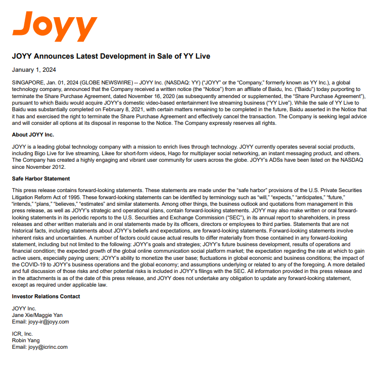 对于百度终止购买YY直播,欢聚集团于1月1日晚间发布公告称,YY直播向百度的出售已于2021年2月8日基本完成,且某些事项仍有待未来完成,但百度在通知中声称,其已行使终止股份购买协议的权利取消了交易。对此,公司正在寻求法律建议,并将针对百度的通知考虑其可以采取的所有选择。