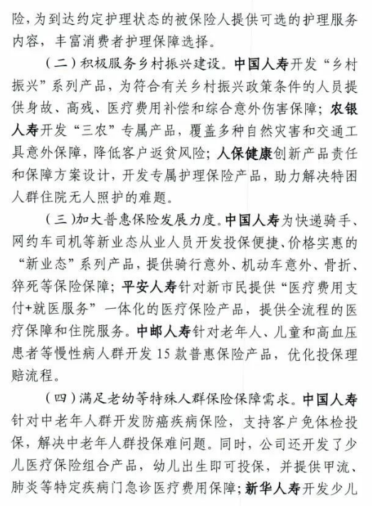 在被表扬的险企中,国家金融监督管理总局人身保险监管司从丰富养老、健康保险供给;积极服务乡村振兴建设;加大普惠保险发展力度;满足老幼等特殊人群保险保障需求四个维度划分人身险产品的丰富度。