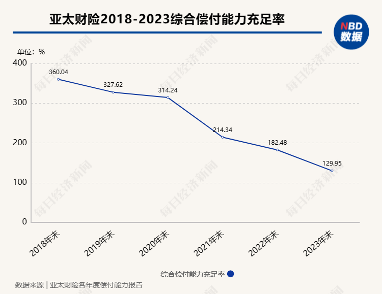 从偿付能力来看,2018年至2022年,亚太财险综合偿付能力充足率分别为360.04%、327.62%、314.24%、214.34%、182.48%,呈逐年下降趋势。截至2023年四季度末,公司综合偿付能力充足率进一步下降至129.95%。亚太财险对此表示,“偿二代二期实施后,偿付能力普遍下降为行业现象,并非企业运营管理问题。目前亚太财险经营状况稳健良好,偿付能力充足,能较好推动公司长期价值保持稳健。”