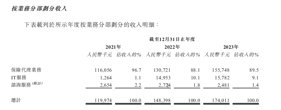 众淼创科主要有三个部分产生收入:保险代理业务、IT服务及咨询服务。据招股书显示,众淼创科主要透过向保险用户分销保险公司合作伙伴的保险产品向其收取佣金来赚取保险代理业务收入。作为保险代理业务的延伸,同时还通过提供IT服务及咨询服务赚取收入。2021—2023年,保险代理业务的收入分别1.16亿元、1.31亿元和1.56亿元的收入,占总收入的96.7%、88.1%及89.5%;IT服务收入分别为人民币130万元、人民币1500万元及人民币1580万元;咨询服务收入分别为人民币270万元、人民币270万元及人民币205万元。此外,众淼创科在首次上市申请前,曾通过增资方式获得A轮和B轮融资,总计筹集资金约1.42亿元。