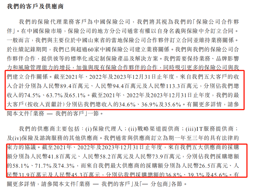 在供应商端,包含保险代理人、战略渠道提供商、IT服务提供商及保险及咨询服务的其他供应商在内,报告期内,众淼创科的五大供应商购买额分别占购买总额的58.1%、71.7%及74.3%,而最大供应商购买额分别占购买总额的36.8%、39.3%及45.6%。众淼创科强调,通常与供应商订立为期一年至三年的具有法律约束力的协议。