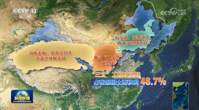 “三北”工程攻坚战占我国国土面积的46.7%。攻坚战启动一年来,已完成造林种草约4000万亩。