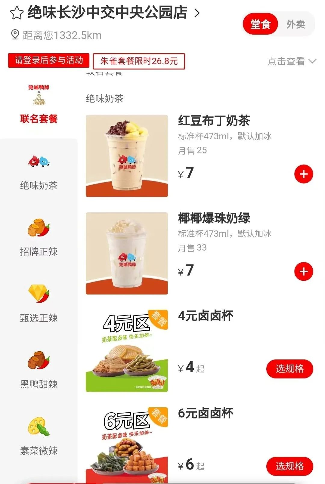 证券时报·e公司记者登录绝味鸭脖官方点单小程序发现,北京的门店并未上架奶茶产品。记者又定位绝味长沙中交中央公园店发现,在下单的“联名套餐”栏下边就是“绝味奶茶”。