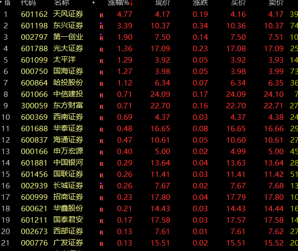 A股券商股午后异动,金证股份盘中涨停,天风证券涨超5%,东兴证券、第一创业、光大证券、太平洋、国海证券、中信建投、东方财富等跟涨。另外,互联网金融概念午后反弹,汇金科技涨超10%,兆日科技、金财互联、天玑科技等跟涨。