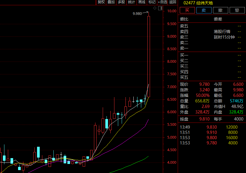 港股经纬天地逆势大涨近50%,截至发稿,报9.62港元,总市值48.1亿港元。
