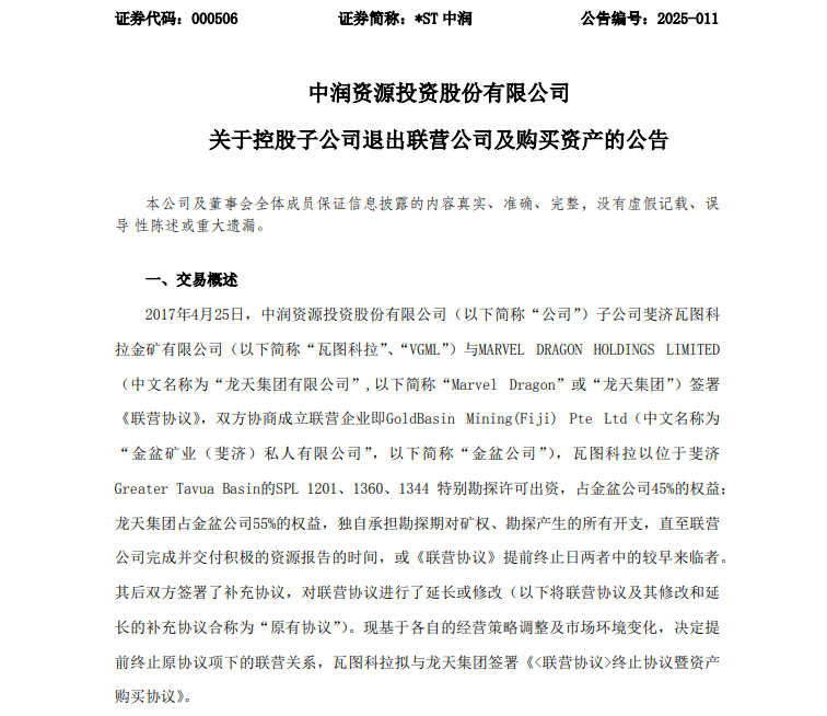 *ST中润表示,本次交易有利于保障瓦图科拉探矿权的完整权益,同时根据北京矿产地质研究院有限责任公司于2024年12月出具的《斐济瓦图科拉金矿外围SPL 1201、1360、1344探矿权资源量估算说明》,SPL1201、SPL1344探矿权区具有一定的找矿前景和空间,有利于公司提升黄金资源储备,增强公司核心竞争力,符合公司整体发展战略。本次交易不会对公司2024年及2025年收入、利润产生影响。