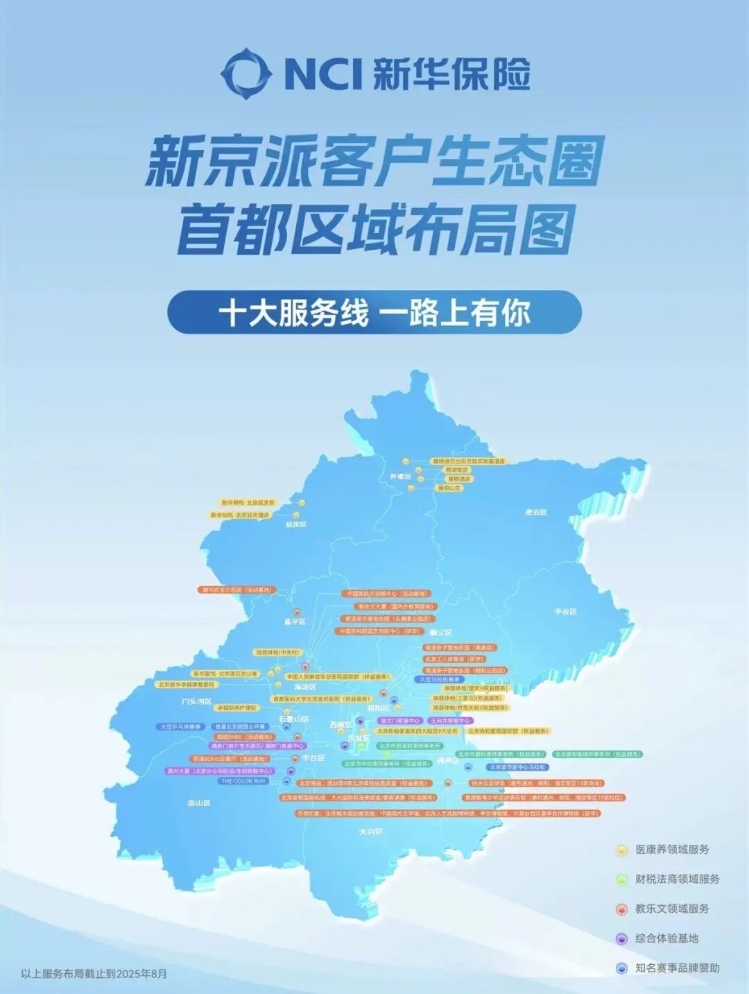 新华保险北京分公司发布新京派服务生态地图,将新华保险10大服务体系、四大服务品牌与京城京韵京彩完美融合。我们致力于为客户铺就更安心、更丰盈的生命旅程。“十大服务线,一路上有你”,从理赔到咨询,从健康管理到家庭保障,无论是旅居度假还是康养生活,无论您身在何处,都能享有及时、专业的医疗支持。我们始终在路上,陪伴您的每一程。