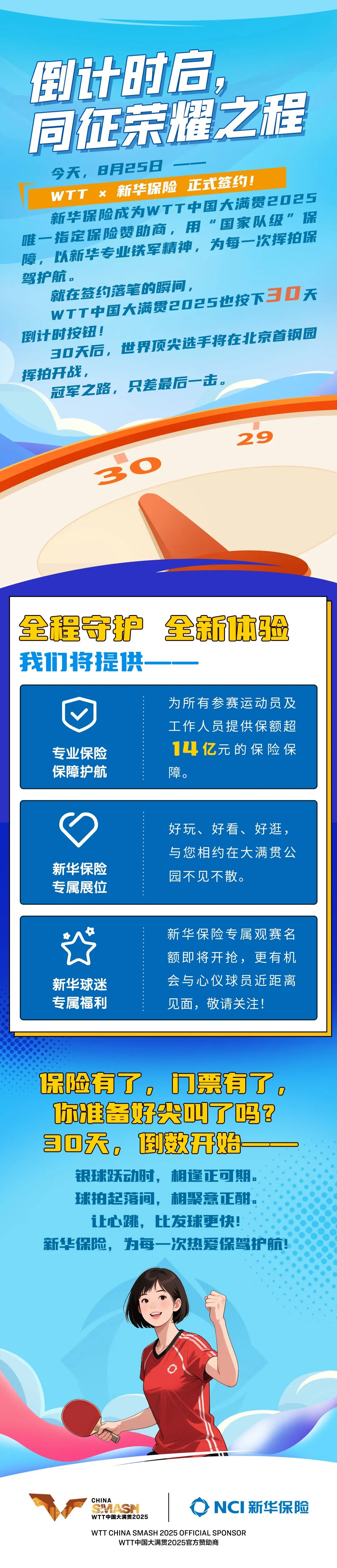 此次携手,新华保险将为WTT中国大满贯赛事倾力护航,提供覆盖赛事运动员、工作人员及志愿者的意外伤害保障,以专业可靠的保险服务,让每一个精彩瞬间都无后顾之忧。