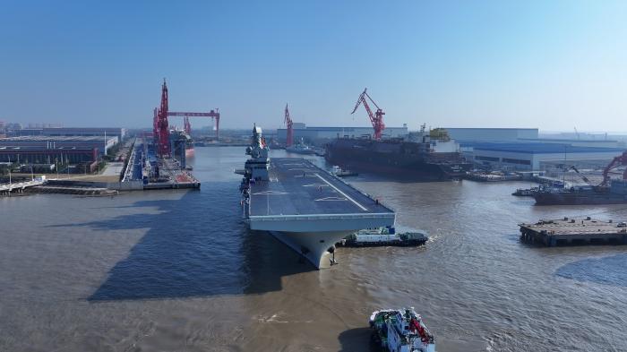 11月14日9时许,我国076两栖攻击舰首舰四川舰从上海沪东中华造船厂码头解缆启航,赴相关海域开展首次航行试验任务。