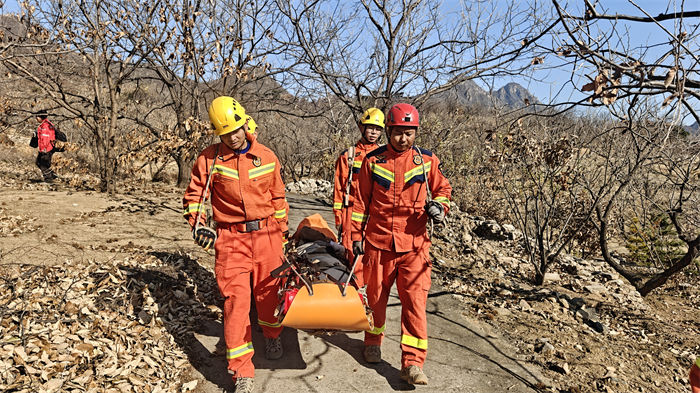 11月14日,一名男子在攀爬野山过程中不慎跌落,身体无法动弹。北京怀柔消防接到报警后,快速赶到现场将人抬到山下。
